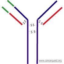All antibodies (also called Immunoglobulins - written as Ig) share some common features. Each contains two smaller proteins (light chains) and two larger proteins (heavy chains). The four proteins that make up the antibody are held together by disulfide (S-S) bonds between cysteine amino acids. Each of the four chains of the antibody contains a constant region and a variable region. The constant (Fc) region contains domains that allow other cells of the immune system to recognize that antibody. The small red pieces represent the light chains and the blue pieces represent the heavy chains. On the left arm of the antibody the variable regions are colored in green (there is also a variable region on the other arm in the same location - not colored here). The disulfide (S-S) bonds that hold the molecule together are shown.