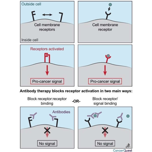 The first type of action is shown below. Antibodies are very specific in what they target, and can block interactions between proteins and signaling molecules. Two different types of cancer driving signals are shown below, the first is caused by the interaction of two proteins on the surface of a cancer cell, and the second is triggered when a signal from outside a cell binds to a receptor (like an antenna) on the surface of the cancer cell.