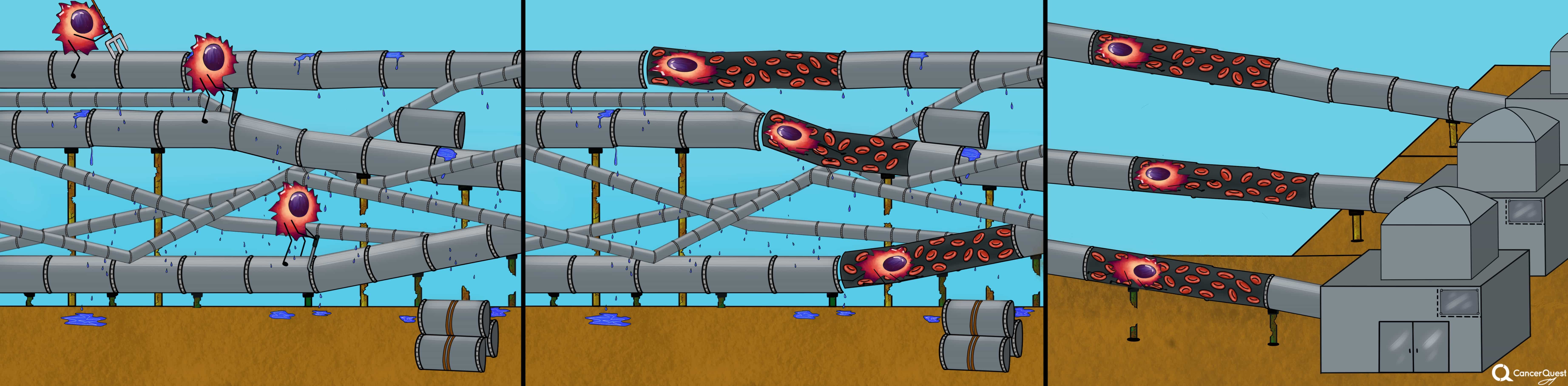 Para reiterar, los vasos sanguíneos hallados en los tumores comúnmente padecen de defectos. Sus estructuras endebles y con fugas facilitan la invasión del flujo sanguíneo de parte de las células cancerígenas.