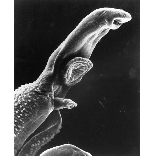 Several different kinds of worm-like parasites (trematodes) are known to cause cancer. The parasites are usually very small and have complicated life cycles, living in several different hosts at different stages in their lives. The life cycle of Clonorchis sinensis is shown above.