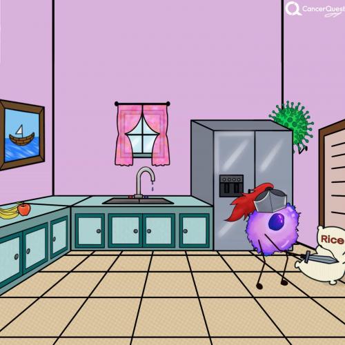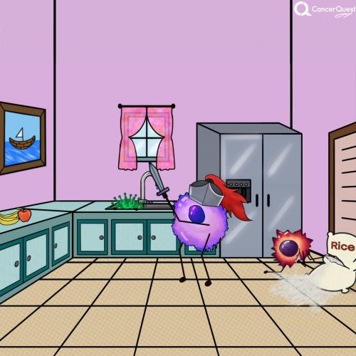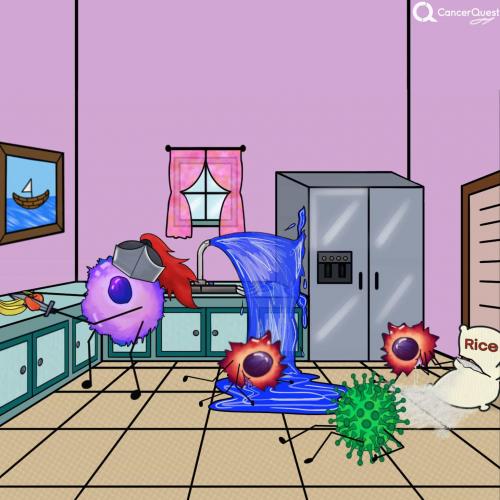 Long-term infection can lead to inflammation that favors the development of cancer. The hepatitis virus (green) is an example of a virus that causes cancer this way. The immune cells (purple) cause changes in the environment that support cancer growth (red).