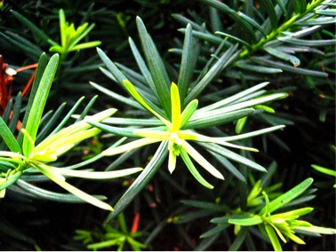 De derecha a izquierda: Agujas de tejo, estructura de 10-desacetilbacatina, estructura de paclitaxel.