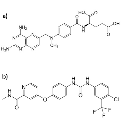 Structure of a) methotrexate b) sorafenib (Nexavar)