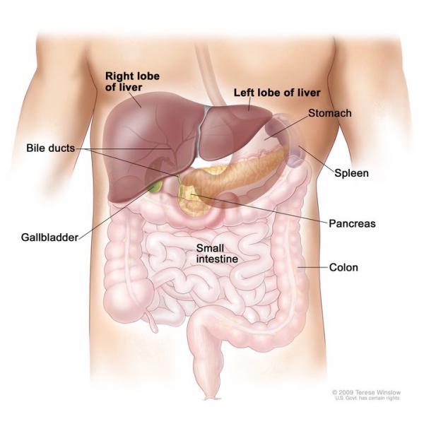 The liver forms part of the gastrointestinal system, which is responsible for breaking down food into smaller parts that can be used by cells. The liver is located in the abdomen, below the ribcage. It is a large organ with many different functions, including:3