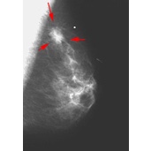The image on the left shows the mammogram of a normal breast, while the image on the right shows a mammogram with an abnormality detected (denoted by the red arrows). Click on the images to visit their source, the Breast Center of St. Louis University.