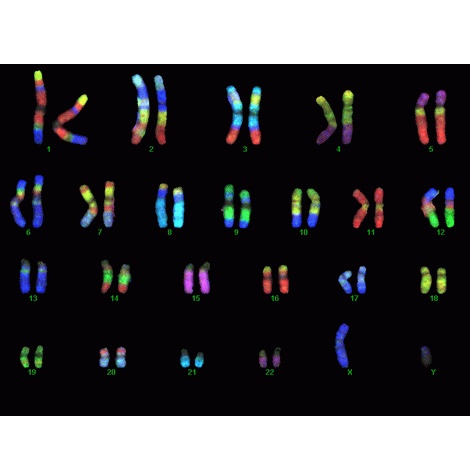 The image below shows the chromosomes from a human cell. The depiction of all of the chromosomes in this manner is known as a karyotype. Karyotypes are often performed on fetal tissues during pregnancy to detect chromosomal abnormalities in the unborn child. These chromosomes have been colored by the binding of fluorescent dyes. Notice that there are two copies of each chromosome. The wide range in sizes of the chromosomes is also apparent. The chromosomes are numbered in the inverse order of their size. Chromosome 1 is the largest chromosome and the smallest chromosomes are those numbered 21 and 22. The karyotype shown below is from a male and contains one X and one (much smaller) Y chromosome. The DNA in even the smallest of the chromosomes contains millions of basepairs.
